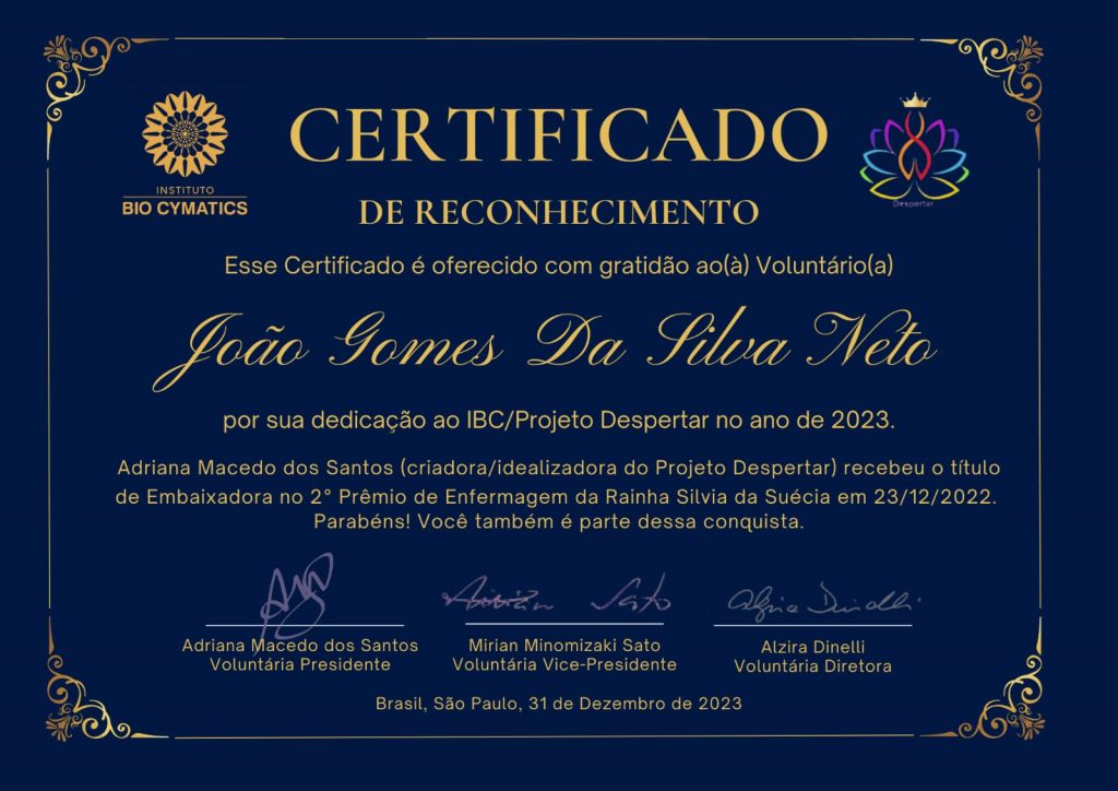 (30/10/2019), o Instituto Bio Cymatics (IBC) se torna voluntário e apoiador com